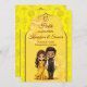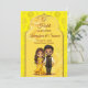 Haldi sangeet linda pareja de novias indias suntuosa personalizado charicatura invitación a boda hindú plantilla editable descarga digital instantánea, arcos de puerta india fondo amarillo y borde de flor dorada todo en uno con el texto RSVP la invitación a bodas hindú haldi mehndi sangeet con personajes adorables de caricatura
