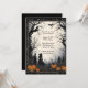 Árboles espeluznantes y farolillos, con figuras misteriosas de negro deambulando por ellos, y una vieja aldea mojada al fondo de esta invitación a la fiesta de Halloween. La espalda es negra sólida. Invitación desconcertante y divertida para adolescentes o adultos.