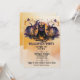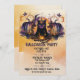 Invitaciones mágicas con un gato brujo y calabazas naranja púrpura.