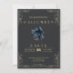 Esta invitación a la fiesta de Halloween respira una sensación de sobria elegancia con su fondo negro y sus sofisticados bordes y escritura de los rincones dorados. El contraste entre el oscuro telón de fondo y los brillantes acentos dorados crea un tono misterioso y lujoso, perfecto para una velada de Halloween. En el centro de la invitación, se ve una figura de Grim Reaper que da un toque de conmovedora intriga. El Grim Reaper, un símbolo clásico de Halloween y lo sobrenatural, añade un elemento escalofriante pero cautivador al diseño, lo que lo hace ideal para un evento temático de Halloween. El esquema de color negro y oro, junto con el motivo de Grim Reaper, crea un llamativo atractivo visual que seguramente captará la atención de los destinatarios y marcará el ambiente para una memorable celebración de Halloween. Ya sea que estés planeando un espeluznante fiesta de disfraces o una elegante pelota de máscaras, esta invitación prepara el escenario para una noche de misteriosa juerga y diversión de Halloween. Envíe estas invitaciones a sus invitados y los invite a unirse a usted para una noche de encanto y emoción mientras celebra Halloween con estilo.