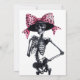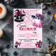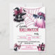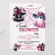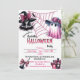 Esta divertida y moda invitación a la fiesta de Halloween ofrece una elegante combinación de rosa y negro, perfecta para darle un toque moderno a sus espeluznantes celebraciones. El diseño incluye elementos caprichosos como un fantasma y un esqueleto adornados con arcos rosas, colocados en el fondo de una delicada telaraña. La tipografía es una mezcla de fuentes góticas y lúdicas, haciendo que la invitación sea divertida y fácil de leer. Con detalles claros sobre la fecha, hora y ubicación del evento, esta invitación es ideal para los que buscan organizar una elegante y espeluznante reunión de Halloween.