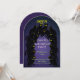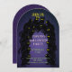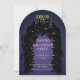 Invitación de Halloween morado enmarcada por un arco de siluetas de gatos negros con ojos chillones. Perfecto para conmovedores sociales, fiestas infantiles, etc.