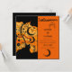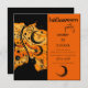 Vibrante invitación de la fiesta de Halloween donde el lado derecho de la invitación se presenta y el fondo del naranja donde se puede personalizar toda la información de su fiesta. La parte izquierda de la invitación a la fiesta de Halloween incluye elementos temáticos de Halloween y celestiales con una gran luna creciente y diseños giratorios centrados en un lindo gato negro. Festiva y sofisticada, misteriosa y celestial con amarillo brillante y naranja - esta espeluznante invitación a la fiesta de Halloween será un éxito con todos tus vecinos, amigos, familia y todos tus invitados de la fiesta de Halloween. ¡Disfruten este!
