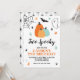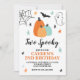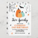 ¡Dos Espeluznantes! Invitación a la fiesta de cumpleaños de Halloween. ¡Tengamos miedo! Invitación de cesta de cumpleaños con calabazas turquesa, estrellas y arañas.