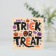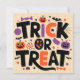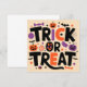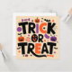 Ce design d’Halloween capture l’esprit festif et fantaisiste de la saison avec une palette de couleurs vives et un thème ludique. Les mots “TRICK OR TREAT” sont affichés en grand au centre, avec des lettres noires audacieuses surmontées de touches orange, donnant l’impression d’une typographie dansante. Autour du texte, une collection éclectique d’icônes emblématiques d’Halloween, notamment des citrouilles souriantes orange vif avec des découpes noires pour les yeux et la bouche, des chauves-souris noires aux ailes déployées, des bonbons violets et oranges en forme de bonbon ou pièce, une toile d’araignée blanche dans le coin supérieur droit avec une petite araignée suspendue, et plusieurs petits fantômes violets flottants. L’ensemble évoque une ambiance joyeuse et enfantine propre à la célébration du 31 octobre.