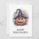 Invitación a la fiesta de Halloween con una acuarela adornada casa, murciélagos y calabazas.
