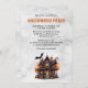 Invitación a la fiesta de Halloween con ilustraciones de acuarela de una casa embrujada, murciélagos, calabazas y una linterna de jack o’lantern usando un gorra de brujas.