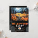 Invitación Halloween negro con luna llena de la casa y murcié