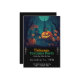 ¡Presentando nuestra invitación a la fiesta de disfraces de Halloween! Prepárate para albergar la velada más espantosa de la temporada con nuestra cautivadora invitación a la fiesta de disfraces de Halloween. Esta invitación capta la esencia de Halloween con un toque de elegancia y un toque de fantasía, prometiendo a sus invitados una inolvidable noche de escalofríos y emociones. La invitación pone el escenario con su rico fondo negro de terciopelo que cubre tanto el dorso como el tercio inferior del frente. Este lienzo oscuro y misterioso crea un aura de misterio encantador, perfecto para un espectáculo de Halloween. Los detalles del evento se muestran cuidadosamente a lo largo de la parte inferior de la invitación. La palabra "Halloween" está dramáticamente escrita con letra de letra naranja, capturando la esencia del espíritu festivo de la festividad. Justo debajo, las palabras "fiesta de disfraces" se presentan elegantemente en un encantador tipo de letra verde, infundiendo un sentido de encanto al diseño. Los demás detalles del evento, como fecha, hora y ubicación, se presentan con gusto en un gris claro refinado, asegurando que sus invitados estén bien preparados para una noche de juerga. Añadiendo un toque caprichoso a la invitación hay dos adorables esqueletos blancos, uno a cada lado del texto "Fiesta de disfraces de Halloween". Estos adorables compañeros dan una sensación de camaradería y diversión a la invitación, marcando el tono para una noche de animada celebración. Pero lo más destacado de esta invitación es la fascinante foto que honra al tercio superior. Contra un telón de fondo de un bosque embrujado, una brillante linterna de jack-o' se alza centinela entre un mar de hojas naranjas de otoño. La luna llena baña la escena en una luz espeluznante pero encantadora, que coloca el escenario para una noche llena de magia y misterio. Nuestra invitación a la fiesta de disfraces de Halloween logra el equilibrio perfecto entre sofisticación y sobrenaturalidad, lo que lo convierte en la elección ideal para aquellos que desean una invitación que combina elegancia con el otro mundo. Invite a sus huéspedes a una noche de encantamiento e intriga con nuestra invitación a la fiesta de disfraces de Halloween. Pida el tuyo hoy y prepárate para albergar una celebración de Halloween que combina perfectamente el estilo con lo sobrenatural!