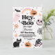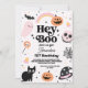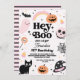 Halloween negro rosado retro Hey Boo Invitación de primer cumpleaños estilo retro dulce hey boo invitación de cumpleaños con un fantasma rosa, gato negro, brujas gorra, escoria, calabazas y más. Ideal para un primer cumpleaños con temática de Halloween en octubre, pero puede ser usado para cualquier edad.