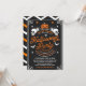 Esta editable tarjeta de invitación para fiestas de Halloween presenta calaveras espeluznantes, arañas y una linterna de naranja y blanco sobre un fondo negro. Es ideal tanto para adultos como para fiestas infantiles.