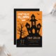 Fijar el tono para una fiesta espumosa de Halloween con nuestra tarjeta de invitación al personalizable! Esta invitación es perfecta para cualquier celebración de Halloween, ya que cuenta con un sobrecogedor fondo naranja con una llamativa silueta de una casa encantada y murciélagos. Personalice la información de fecha, hora, ubicación y RSVP para que se ajuste a su evento. La tarjeta está diseñada profesionalmente con colores vivos y siluetas detalladas para capturar el espíritu de Halloween. Ideal para fiestas de Halloween, animadas celebraciones y espeluznantes reuniones, esta invitación de alta calidad hará que tu evento de Halloween sea inolvidable.