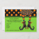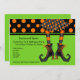 La bruja de Halloween con medias de rayas y invitación a botas... con medias de brujas graciosas y botas sobre un fondo verde brillante.. viene con sobres blancos... invitaciones para fiestas de Ricaso algunas imágenes con licencia de CU delightful-doodles.com