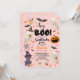Halloween Spooktacular Rosado Primer Día Invitación de Boo-Day. ¡Demasiado lindo para hablar! Invite a sus invitados a celebrar su primer día de fiesta con esta adorable invitación de cumpleaños de Halloween con temática fantasma. Sorprende a tus invitados con esta encantadora invitación con fantasmas lindos, calabaza divertida, gato negro lindo, dulces de halloween, baño negro y fondo rosa pastel,