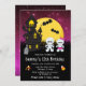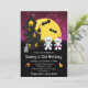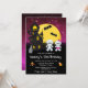 Esta divertida y espeluznante invitación para el cumpleaños incluye a las hermosas momias junto a una casa embrujada. En el fondo hay una luna llena con murciélagos y un cielo nocturno rosa con estrellas. El texto combina fuentes decorativas y serif para un estilo elegante y moderno. Esto es perfecto para Halloween.