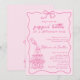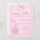 Introducing the "Popping Bottles" Funny, Funky & Whimsical Hand-Drawn Baby Bottle Champagne Tower Baby Shower Invitation in lovely pink for a girl baby shower – A trendy and playful invite to celebrate the parents to be! Featuring a squiggly frame with a charming coquette bow, this design is accented with a hand-drawn champagne tower being poured over by a baby bottle in the bottom corner. With soft pink background and a combination of handwritten script and funky block fonts in pastel pink, creating a fun yet elegant vibe. Perfect for setting the tone of an unforgettable baby shower with friends and family. Easily customize this editable baby shower invitation template with your event details. Also available as an instant digital download for easy sharing via email, text, or social media.