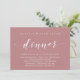 Mark the beginning of your forever with elegance using our contemporary dusty rose pink theme wedding elopement celebration invitation card, "Happily Ever After Dinner". Perfect for couples extending their joyous occasion, this invitation exudes sophistication with a hint of playfulness, setting the stage for a memorable event. Adorned with a timeless modern script design theme, it adds a touch of refined charm to your festivities. Crafted by TeeshaDerrick, this invitation promises to beautifully capture your love story.