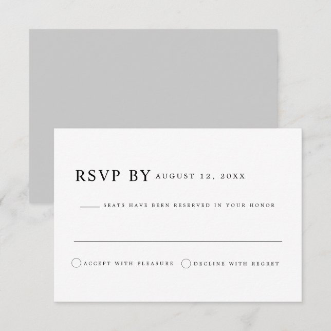 Esta tarjeta RSVP matrimonial presenta un emparejamiento de colores gris y blanco con un diseño minimalista moderno. Edite todo el texto para su evento. Esta tarjeta de respuesta es perfecta para su moderna ducha minimalista, cena de compromiso, fiesta de retiro o cualquier otra ocasión especial.