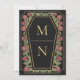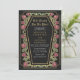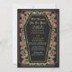 Haz una declaración audaz de amor eterno. Esta invitación gótica a la boda muestra ‘Hasta la muerte nos hace parte’ en un marco en forma de ataúd, adornado con espinas, rosas y acentos dorados sobre un fondo negro. ¡Perfecto para una celebración romántica! Personalice el texto, la fuente y el color de fondo para que se ajusten a sus preferencias de diseño. Artículos coincidentes en nuestra tienda para un tema fiesta completo. Tenga en cuenta que el oro de la invitación NO es un Relieve metalizado real y está impreso en colores planos.