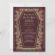 Haz una declaración audaz de amor eterno. Esta invitación gótica a la boda muestra ‘Hasta la muerte nos hace parte’ en un marco en forma de ataúd, adornado con espinas, rosas y acentos dorados en un rico fondo rojo. ¡Perfecto para una celebración romántica! Personalice el texto, la fuente y el color de fondo para que se ajusten a sus preferencias de diseño. Artículos coincidentes en nuestra tienda para un tema fiesta completo. Tenga en cuenta que el oro de la invitación NO es un Relieve metalizado real y está impreso en colores planos.