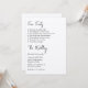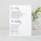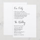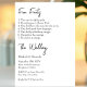 Esta invitación a una boda de estilo moderno y minimalista presenta un diseño sencillo con un elegante tipo de letra negro, impreso en el estilo de una lista. Una lista de hechos divertidos sobre la novia y el novio o la pareja están impresos en la parte superior,[ seguido de la información del boda. Es una forma sencilla y única de entretener a los clientes y dejarles ver un lado personal.