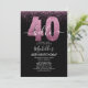 Hello 40! Invite your friends and family to celebrate the 40th birthday with this modern design. The design features a black background, the numbers thirty in faux pink glitter, with an elegant pink glitter background, elegant calligraphy script, a modern birthday template that's easy to personalize, and the option to add a photo to the reverse. Don't think about it and get yours now.