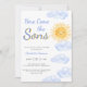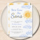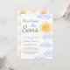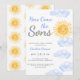 Invite family and friends to your sun-themed twin boys' baby shower with this cute invitation. It features the text "Here Come The Sons" in stylish blue typography with a yellow watercolor sun and clouds. The back is decorated with a sun pattern. Easily customizable. Original Watercolor © Michele Davies.