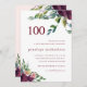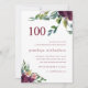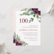 Hermosa y moda acuarela botánica floral y verde, invitación a la fiesta de cumpleaños número cien, cuenta con una encantadora espalda rosa pastel con flores y vegetación borgoñas moradas, y un frente blanco con elegante tipografía de 100 años y flores con follaje.