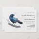 Invitación a la boda con un adorable dibujo acuarela de un cuervo. Los colores azul oscuro y violeta acentúan la belleza de este pájaro.
