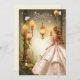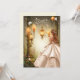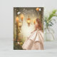 Hermosa invitación Sweet 16 con un chica vestido con un precioso vestido al lado de las bonitos brillantes lámparas de jardín en un bosque. Dulce Dieciséis textos se hacen en una hermosa plata.