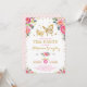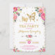Invitación a una fiesta de té femenina con tema de mariposa que presenta una hermosa ilustración de acuarela rosada y flores rosadas intensas y un par de mariposas doradas intrincadas