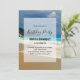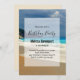 Invitación a la fiesta de cumpleaños con una hermosa fotografía con un mar azul turquesa y una playa de arena con montañas en la parte trasera.