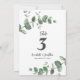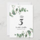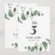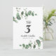 Hermoso diseño delicado y elegante de número de mesa de boda con follaje de eucalipto económico. Moderna y elegante colección rústica contemporánea de moda en verde salvia, negro, azul marino y blanco. Ideal para bodas de primavera, verano, otoño o invierno.