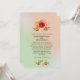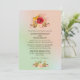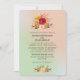 Una invitación de boda con un hermoso diseño floral de flores silvestres con flores en rojo y amarillo, contrastadas con hojas y ramitas rosadas y marrones. Puesta sobre un fondo degradado de verde menta y rosa coral claro.
