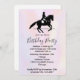 Invitación a la fiesta de cumpleaños con un ilustracion blanco y negro de un jinete de ropa. El caballo y el jinete están tocando una pirueta. Elegante y hermoso. Colocado en un fondo acuático de colores pastel delicados y mullidos.