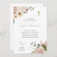Esta bonita invitación para Bautizo o Cristián presenta flores de acuarela de moda en tonos de melocotón terracota, marfil y rosa con hermosas hojas verdes. También hay una elegante cruz dorada falsa y tipografía de letra script moderna.