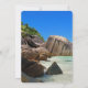 Invitación al cumpleaños con una fotografía de una playa azul turquesa de océano con grandes rocas esparcidas a lo largo de la costa. Lugar tropical luminoso y soleado.