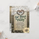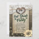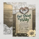 Estilo Rústico de Campo COMER Beber y Fiesta / COMER Beber y Casarse Tarjetas de Invitación para Bodas - Pareja Herradura Antigua con Corazón y Lazo de Cuerda y Encaje Blanco, Girasol, Luces de Cadena y Tela de Arpillera sobre Fondo de Madera de Granero Antiguo.