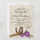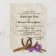 El estilo de país "ata al Knot" con esta no tan tradicional invitación a la boda. Dos herraduras atadas dentro del nudo de la cuerda y acentuadas con margaritas moradas.