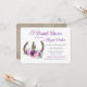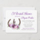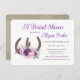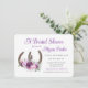 Bonito floral Purple bouquet y zapatos rústicos de caballo diseño invitación a la ducha de novia con texto editable y diseño de madera de grano en la parte trasera.