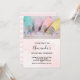 Invitación de cumpleaños con una fotografía de color pastel. Con pasteles decorados en azul pastel, rosa, melocotón y amarillo. Sobre una mesa de madera con pequeñas perlas de colores.