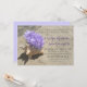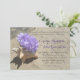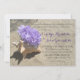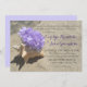Una hidrato violeta de bonito llena una concha tropical de concha de playa en la arena, estilo fotografía de la invitación a bodas de playa con texto personalizado, acentuado en morado.