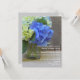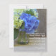 Invitación a la boda con una foto de un frasco de masas de hortensias azules. La jarra se sienta en una superficie de arpón. El fondo es madera de paja.