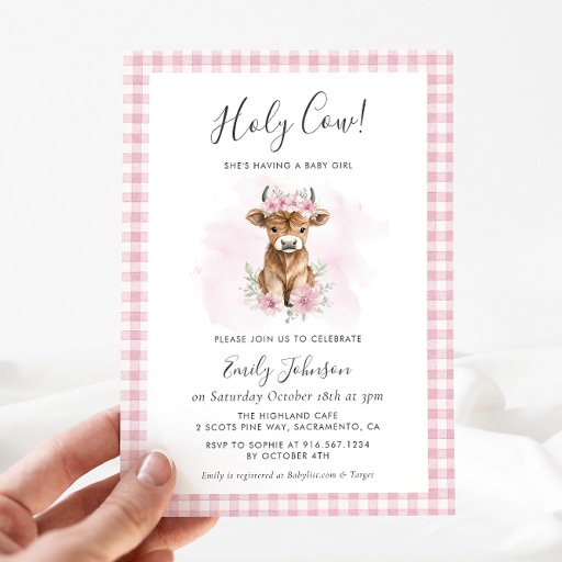 Celebrate the upcoming arrival of a precious baby girl with this charming “Holy Cow!” baby shower invitation. Featuring an adorable watercolor baby calf wearing a boho flower crown, surrounded by soft pink florals and a classic pink gingham border, this invitation is perfect for a sweet western or farm themed baby shower.