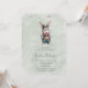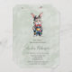 A cute cartoon illustration of a bunny wearing a gray fedora hat with a red band and round wire-rimmed glasses. The bunny has a cheerful expression with rosy pink cheeks and a small smile. It is wearing denim overalls with colorful patch details - yellow, pink, green, and blue squares sewn onto the legs. A red polka-dotted bow tie adorns its neck. The bunny's fur is rendered in light beige with subtle gray tones, and its ears are perked up and forward. The bunny is standing in a three-quarter view pose against a pure white background. The art style is soft and watercolor-like with clean lines and gentle shading. The overall composition has a whimsical, child-friendly aesthetic with a hipster-inspired outfit.