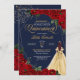 Invitación quinceanera en rosa rojo rubí con acentos dorados y un chica con elegante bata de bolas en un esquema de colores de Beauty and the Beast. Consulte la tienda para ver esta invitación con chicas de diferentes colores de cabello y tonos de piel.