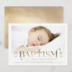 Tarjeta de invitación religiosa para bautizo con tipografía moderna y elegante de lámina de oro falso sobre fondo negro y foto en cruz en negrita.