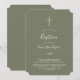 Esta invitación mínima al bautismo verde oscuro en hoja es perfecta para un bautismo de bebé boho. El diseño presenta una sencilla silueta de hojas de vegetación en verde oliva con un estilo bohemio minimalista de montaña.