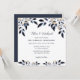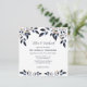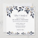Hojas azules con invitación a la Boda de Oro diseñada con hojas de flujo suave en tonos azul marino oscuro y azul claro, acentuadas con resaltes dorados. El texto principal incluye: Los primeros nombres de la novia y el novio, junto con sus familias, los nombres completos de la novia y el novio, la fecha del Boda, la hora, el nombre y la dirección de la ubicación y la recepción a seguir. El texto en reverso incluye: RSVP y Tus Detalles de Respuesta sobre un azul marino oscuro con acento floral. Para personalizar, simplemente inserte los detalles de su boda en nuestra plantilla sencilla, reemplazando el texto de ejemplo. Asegúrese de ver todas las hojas azules con colección Boda dorada para tarjetas y accesorios a juego.