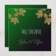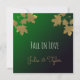 Tarjeta de invitación cuadrada con hojas de arce dorado en un fondo de gradiente esmeralda. Viene con texto, "Caer en amor". Elegantes invitaciones o invitaciones para que su boda en otoño o otoño Ambos lados sean personalizados! Diseño de plantillas por Alma Wad